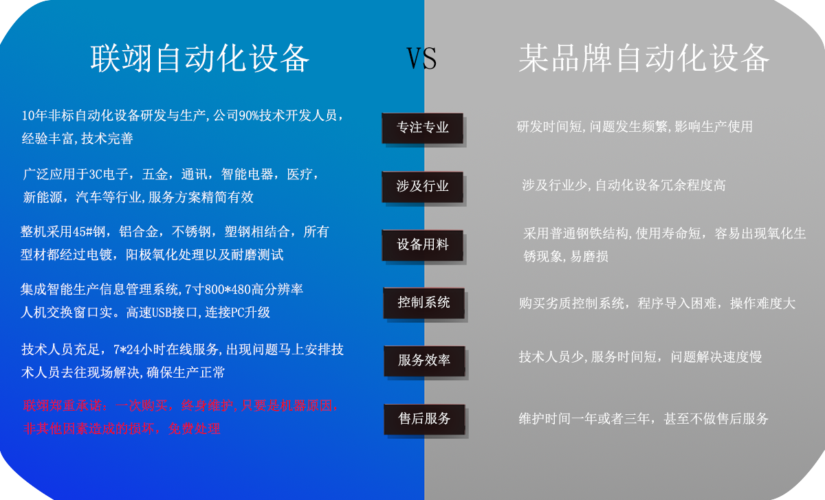 以后再說X東莞市聯(lián)翊智能設(shè)備科技有限公司創(chuàng)于2012年,專業(yè)研發(fā)制造自動(dòng)組裝機(jī),自動(dòng)裝配線等非標(biāo)自動(dòng)化設(shè)備.